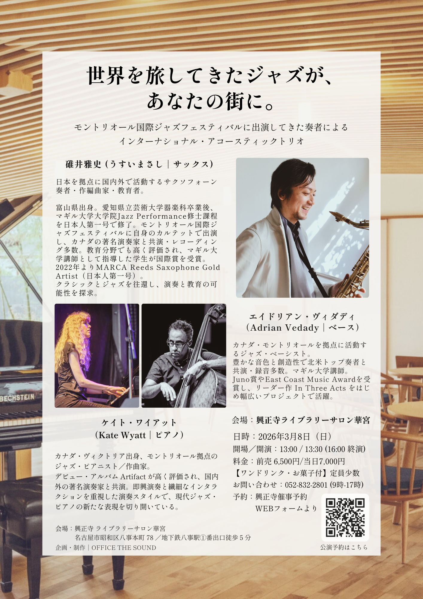 | ■ 3月8日(日)|名古屋 興正寺 ライブラリーサロン華宮(アフタヌーン) https://www.koushoji.or.jp/event/event-99387/ OPEN 13:00 / START 13:30 ※16:00 終演予定 前売 6,500円 / 当日 7,000円 ワンドリンク お菓子付 定員少数 お問い合わせ:052-832-2801 (9時-17時) 予約:興正寺催事予約WEBフォームより 住所 名古屋市昭和区八事本町78 地下鉄八事駅1番出口より徒歩5分 |