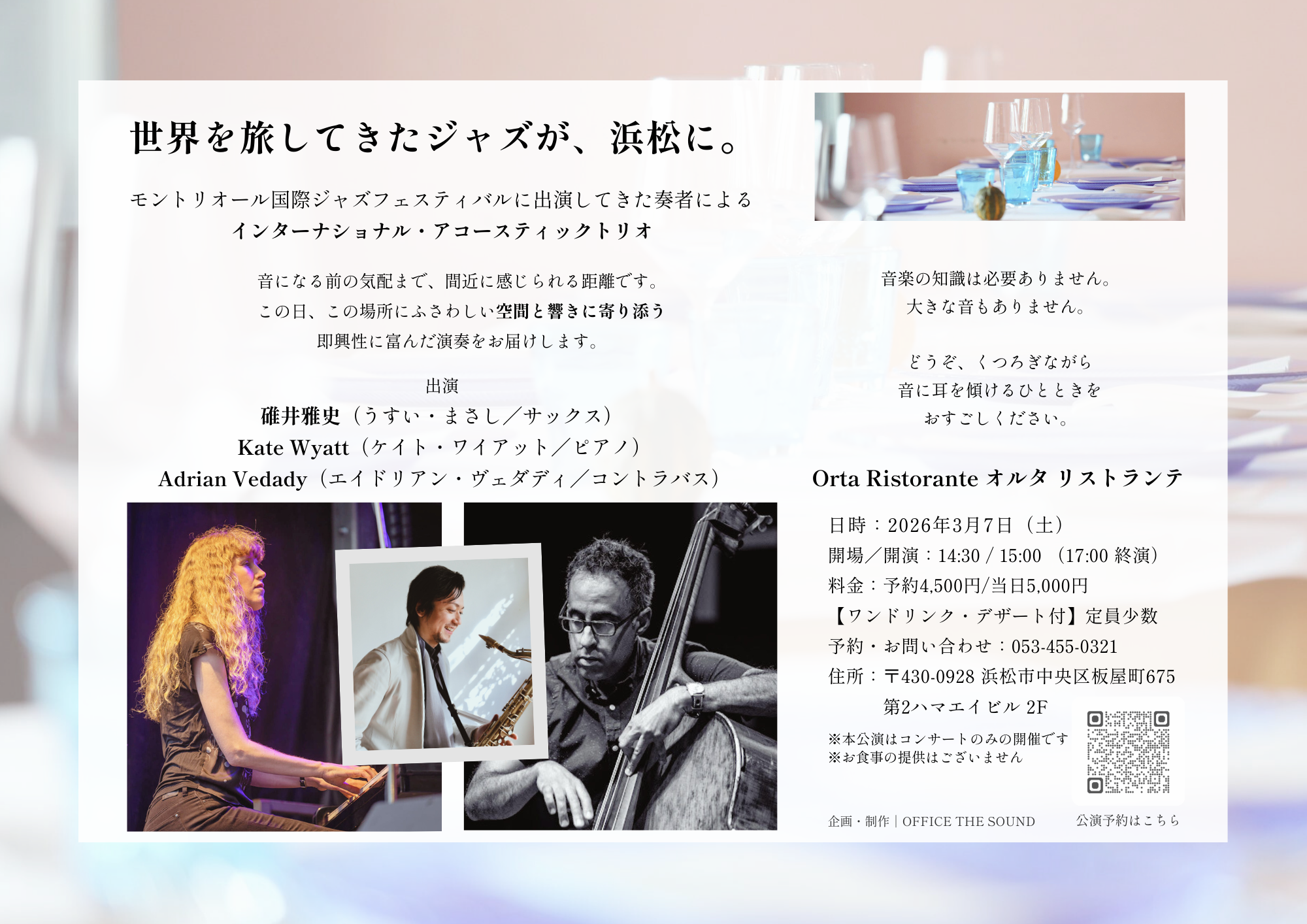 | ■ 3月7日(土)|浜松 オルタリストランテ(アフタヌーン) https://www.ortaristorante.com OPEN 14:30 / START 15:00 ※17:00 終演予定 予約 4,500円 / 当日 5,000円 ワンドリンク デザート付 定員少数 予約・お問い合わせ:053-455-0321 ※本公演はコンサートのみの開催です ※お食事の提供はございません 住所 〒430-0928 浜松市中央区板屋町675 第2ハマエイビル2階 |